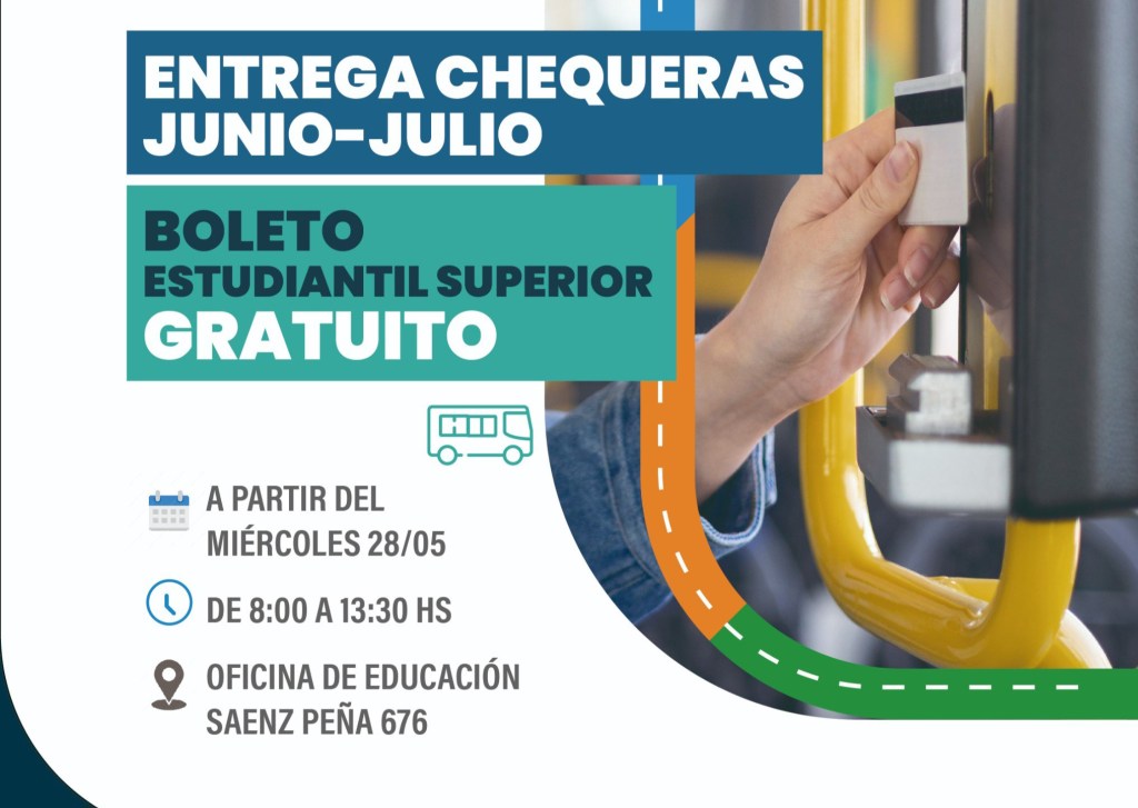 La Subsecretaría de Educación y Juventud del Municipio de Brandsen informó que a partir del miércoles 28 de mayo comenzará la entrega de las chequeras correspondientes a los meses de junio y julio del Boleto Estudiantil Superior Gratuito (BESG). La entrega se realizará en la Sala de Cultura municipal, ubicada en Sáenz Peña 676.