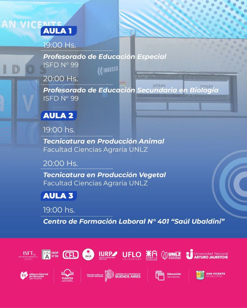 Por último, en el Aula 3, a las 19:00, se presentará la propuesta del Centro de Formación Laboral Nº 401 “Saúl Ubaldini”.