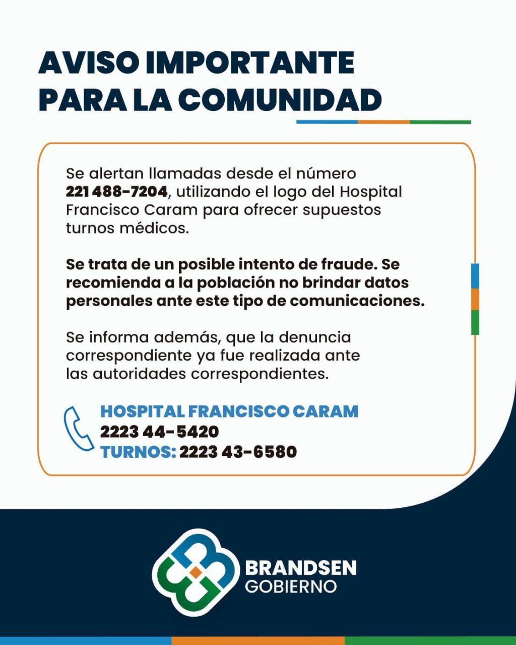 La Municipalidad de Brandsen indicó en un comunicado oficial que se han detectado llamadas telefónicas provenientes del número 221 488-7204, en las que se utiliza de manera indebida el nombre y el logo del Hospital Municipal Francisco Caram para ofrecer supuestos turnos médicos.